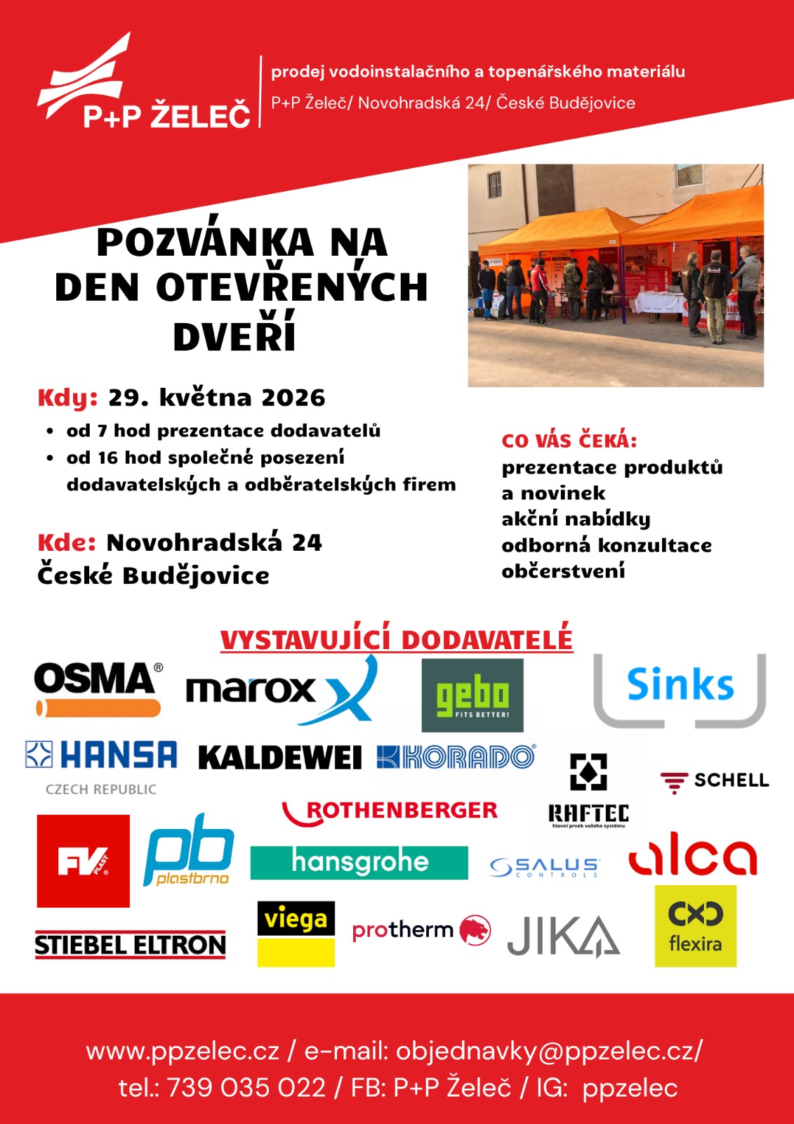 Zveme Vás na Den otevřených dveří společnosti P+P Želeč, který je určen nejen pro odborníky z oblasti vodoinstalací a topenářství, ale také pro širokou veřejnost – zejména pro všechny, kteří plánují stavbu nového domu, rekonstrukci koupelny nebo modernizaci vytápění.